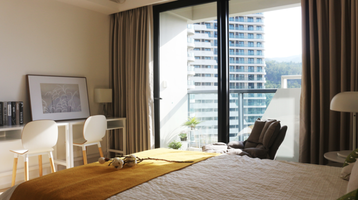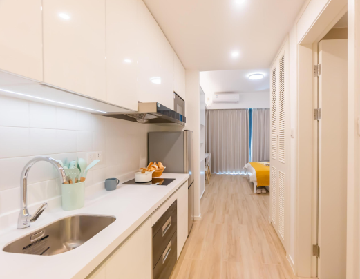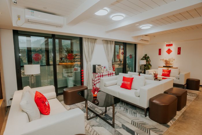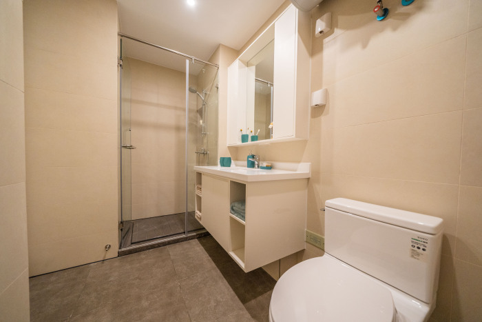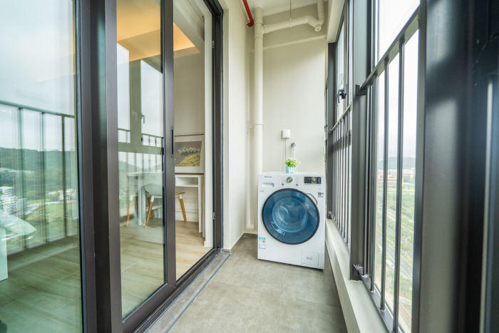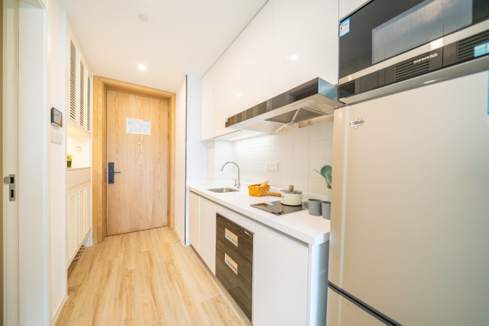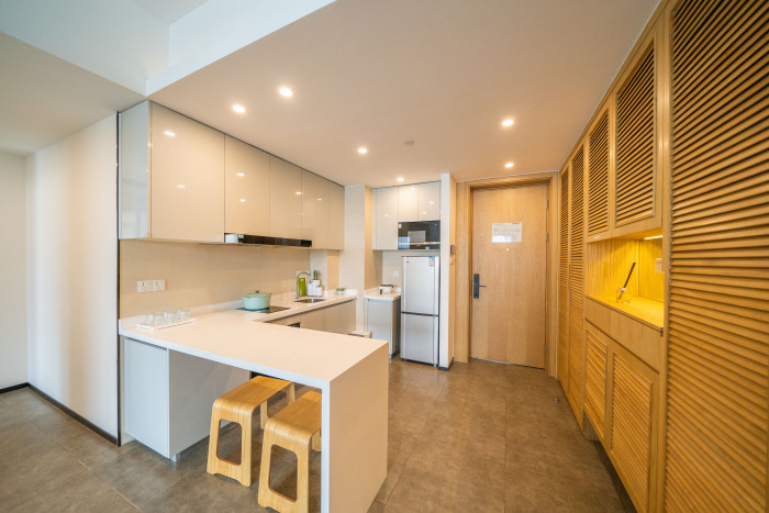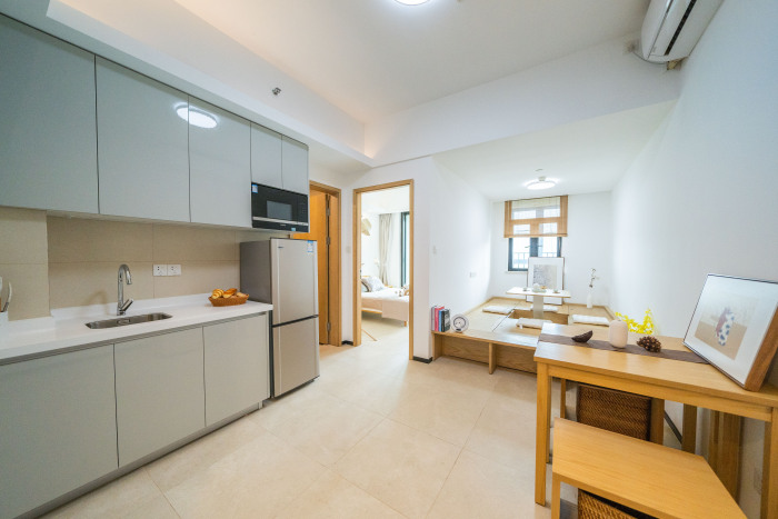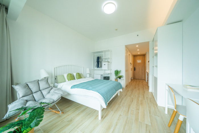 充分利用户型内空间,分为洗漱区、起居室配备双人床、沙发、电视、书桌等设施、独立卫生间做到了干湿分离、满足了现有年轻人个性需求。